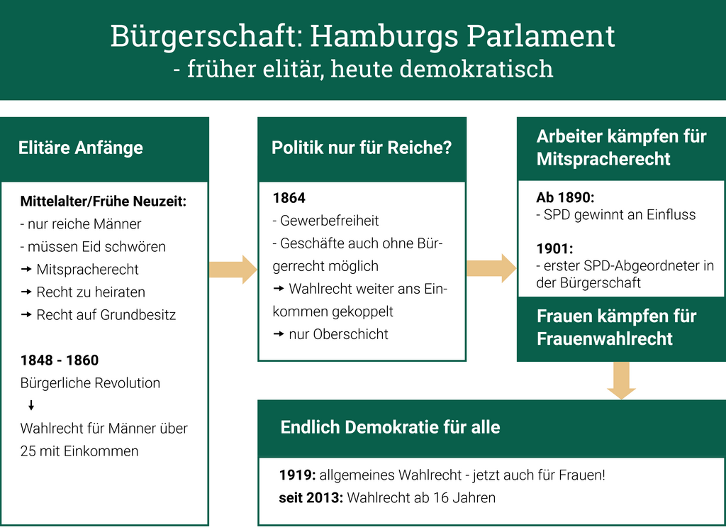 Beeinflusst durch die Ideen der bürgerlichen Revolution von 1848 wollte nun auch ein Großteil derjenigen Einwohner Hamburgs Bürger werden, denen das bislang verwehrt worden war. 1860 kam es deshalb zur Verfassungsreform: Von nun an erhielten alle männlichen, über 25-jährigen Einkommensteuer zahlenden Bürger politische Rechte. Durch diese Regelung hoffte man, das soziale Missverhältnis zwischen denen, die im Parlament saßen, und denen, die das Wahlvolk ausmachten, auszugleichen. Aber die Kluft war immer noch immens: Kaufleute, Juristen, Ärzte, Apotheker, Lehrer, gefolgt von wenigen kleinen Händlern und Handwerkern, machten das Gros der Abgeordneten aus.