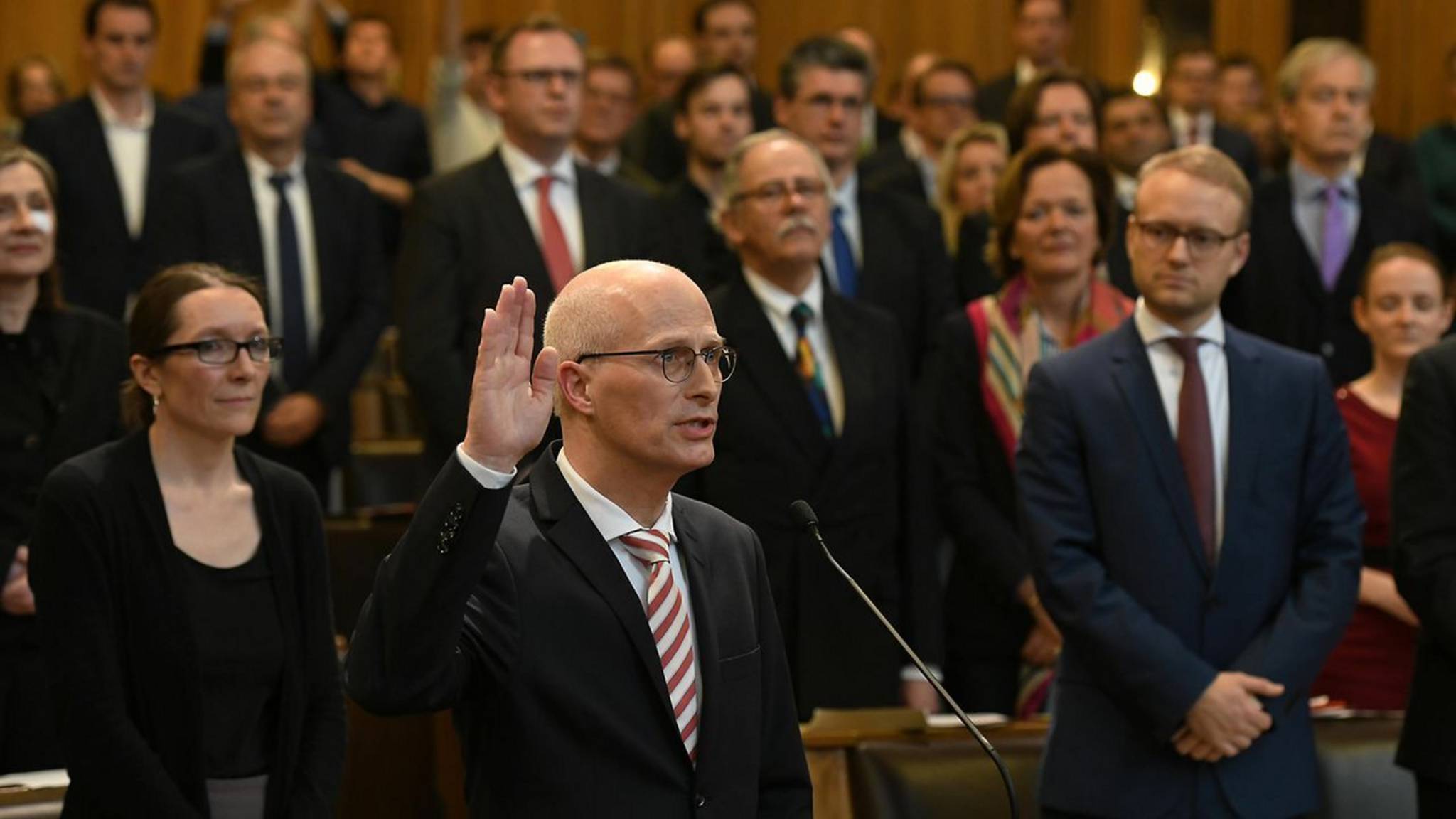 „Die Amtszeit der Ersten Bürgermeisterin oder des Ersten Bürgermeisters endet auch, wenn die Bürgerschaft ihr oder ihm das Vertrauen dadurch entzieht, dass sie mit der Mehrheit ihrer gesetzlichen Mitgliederzahl eine Nachfolgerin oder einen Nachfolger wählt. Der Antrag muss den Abgeordneten und dem Senat mindestens eine Woche vor der Beschlussfassung mitgeteilt werden; er muss von einem Viertel der Abgeordneten unterzeichnet sein.“